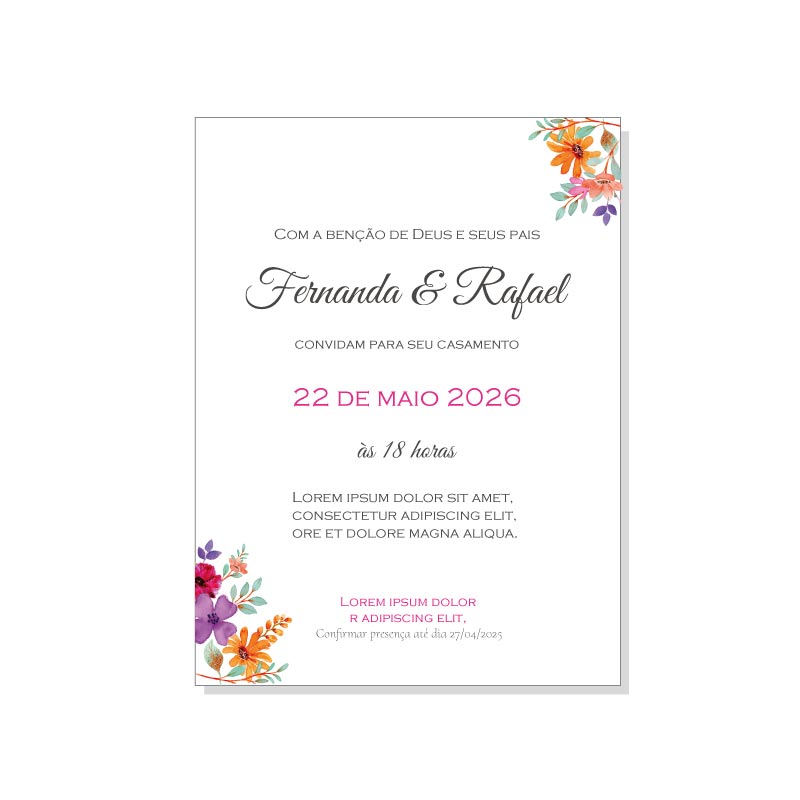 Arquivo com Arte Digital Convite Casamento – Fucsia e Laranja Tropical! Para casamentos e eventos no tema tropical que combinam com paleta de cores: fucsia, amarelo, laranja, rosa e roxo.