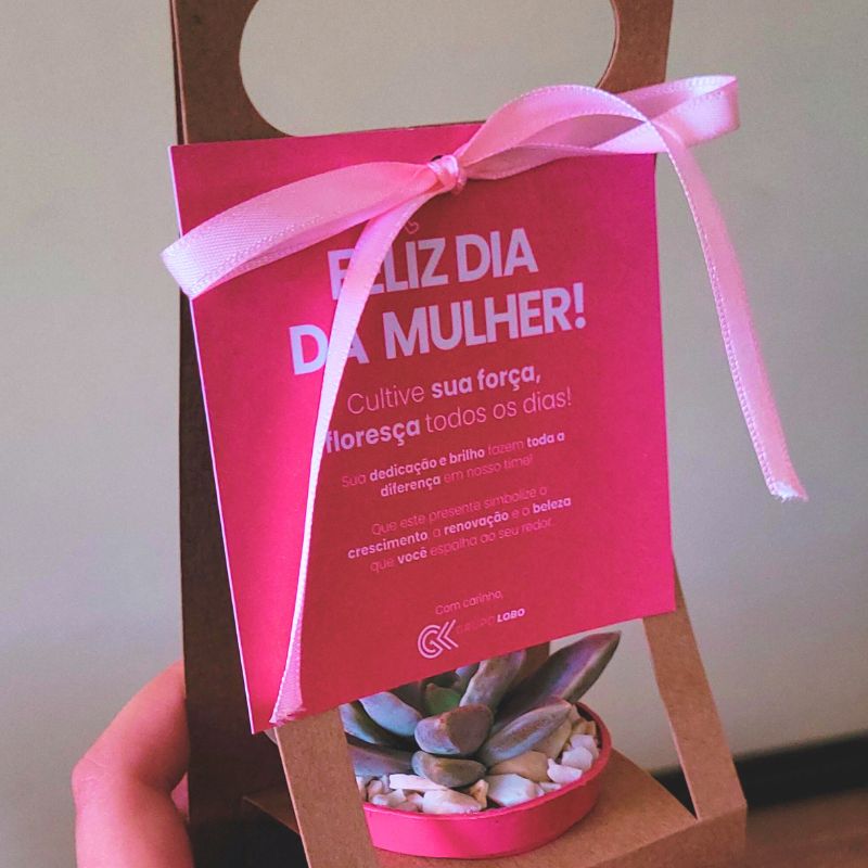 Linda sacola com suculenta vaso rosa em papel kraft com acabamento delicado de pedrinhas brancas no vaso. Opção ideal para quem gosta de fácil transporte, acompanha plaquinha com dizeres!